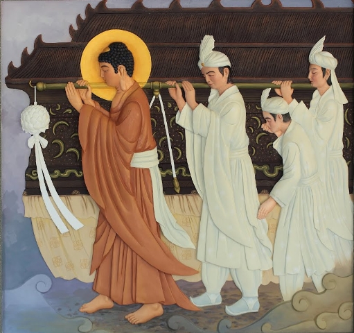 釋迦牟尼佛出生於北印度迦毘羅衛城,為淨飯王之太子悉達多,當他的父親淨飯王去世了,出殯時佛陀也參加了諸位王子抬棺的行列,親自為父王抬扶棺木。為了報答母后摩耶夫人的生育之恩,他特地以神通到忉利天宮為母親說法三個月。