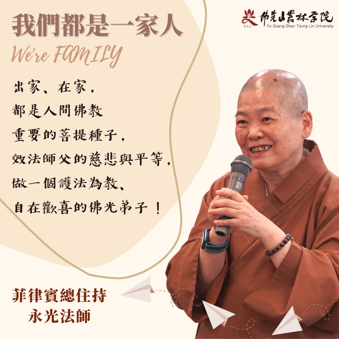 叢林消息 【我們都是一家人——與永光法師有約】 2022-12-11 字級: 小 中 大 禮請菲律賓總住持永光法師與叢林學院學生進行「師兄長時間」座談,並為大家的修行學習「把脈」。 【治心秘方】 問:修行路上,我們要如何訓練自己的耐力、恆常心及信心,並保持自己的活力,讓弘法豐富多彩? 答: ①自己要先歡喜,才能給人歡喜 ②告訴自己「我可以」:要懂得自我鼓勵,也可以透過師父上人星雲大師的法語,來提起自己的修道信心與恆常心。 ③學習活在當下:像海綿一樣吸收、累積,待因緣成熟之際就能發揮功效。 ④做自己能做的事:保有菩薩的慈悲心腸,不必與他人計較、比較。 【處眾秘方】 問:在弘法路上遇到困難如何解決?碰到不如意的人事物可以怎麼做呢? 答: ①看見問題所在,輸入正確的方法:只要針對事情去解決問題,其餘的情緒糾結不要留心中。 ②「修行」是自己選擇的:常以初心提醒自己,與佛菩薩接心 ③菩薩的慈眼:懂得欣賞他人、給人掌聲,在逆境中也可以增上緣。 永光院長勉勵學生們「我們都是一家人」,身為佛光山及星雲大師的弟子,無論出家、在家都是人間佛教重要的菩提種子,多閱讀師父上人的書籍,效法師父超越種族、性別、國界的慈悲與平等,做一個護法為教、自在歡喜的佛子! 返回上一頁