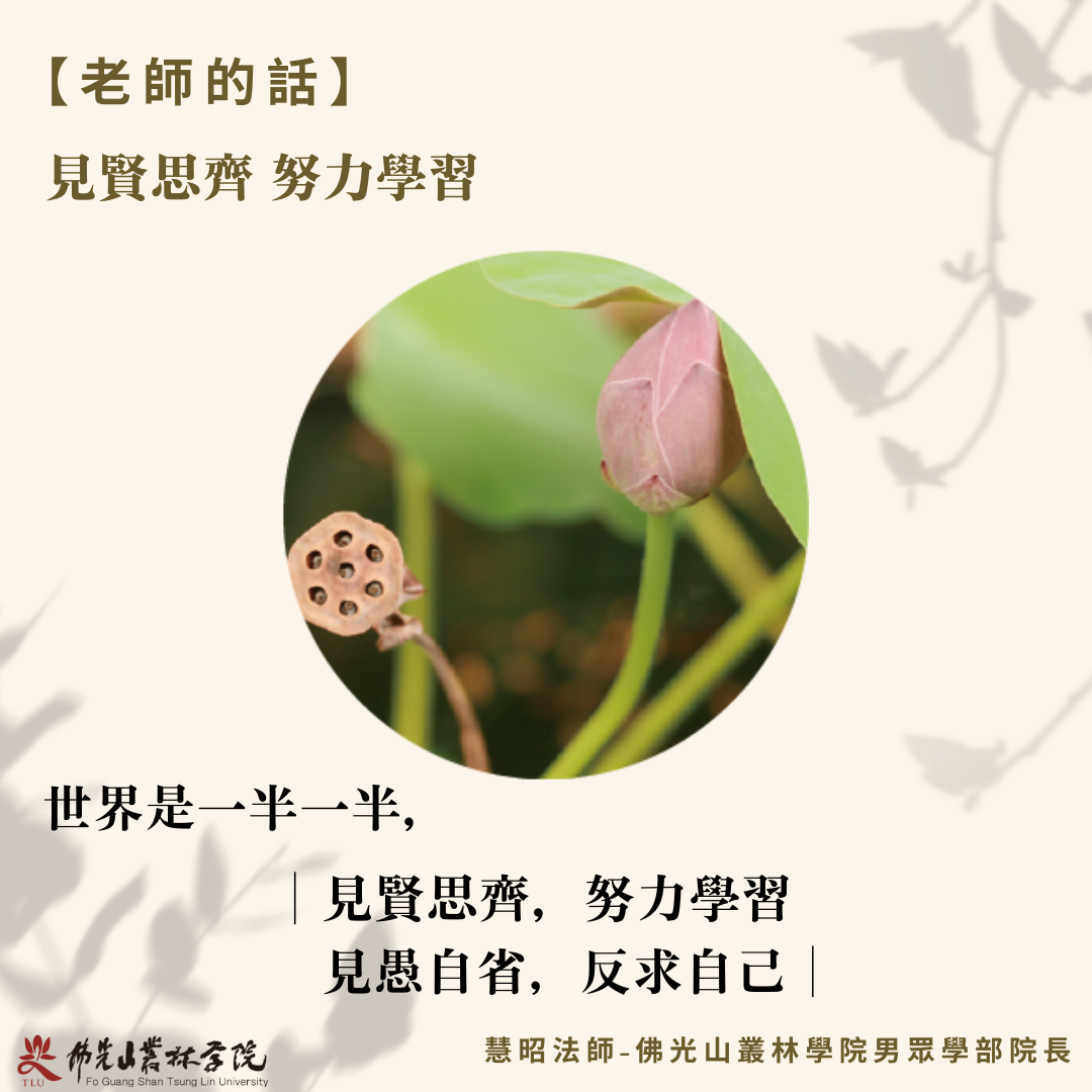 叢林消息 【老師的話】見賢思齊 努力學習 2021-10-04 字級: 小 中 大 文/慧昭(佛光山叢林學院男眾學部院長) 佛光山開山星雲大師曾說:世界是一半一半,好人一半,壞人一半;有德賢聖者一半,無德凡愚者一半。對於有德賢聖者,要能見賢思齊,努力學習。所謂「舜何人也?予何人也?有為者亦若是!」同樣的,佛陀何人也?星雲大師何人也?有為者亦若是! 對於有德賢聖者,要能見賢思齊,努力學習;對於無德、凡愚者,見不賢者該如何自處呢? 如寒山問拾得:「世間謗我、欺我、辱我、笑我、輕我、賤我、惡我、騙我,如何處治乎?」拾得云:「只是忍他、讓他、由他、避他、耐他、敬他、不要理他,再待幾年你且看他。」 星雲大師說:「不知道很美。」有些事情要能看破不說破,不要拿別人的過失來懲罰自己,要能自覺,其實這些人都是我們的大善知識、大功德主,是來成就我們的。 最後以一首偈語跟大眾共勉:「見賢思齊,努力學習;見愚自省,反求自己。」 全文詳閱 https://reurl.cc/vgmGKN 佛光山叢林學院 110學年度 開學招生中 返回上一頁
